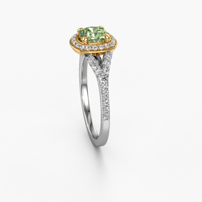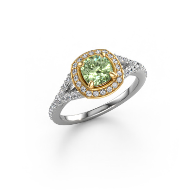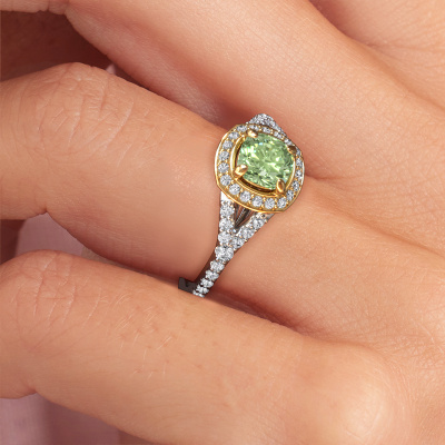The ring shown above is called the Pamela CUS. We call this type of ring a halo ring because it has one centre gemstone and a band that is also pave set with gemstones. The 14 Carat white gold engagement ring is set with a cushion 5.5 mm green lab grown diamond centre stone and the band is pave set with lab-grown diamonds. What makes this luxury white gold pavé solitaire ring special are the smaller sized stones embracing the centre stone. This gorgeous engagement ring is called a pavé solitaire ring because the smaller gemstones give the centre stone a pavé solitaire of surrounding light. In order for the smaller stones to enhance the centre stone, they have to be placed so there is no interference of light. And that's when our expert goldsmiths come in. Each individual stone is carefully set in the ring by hand. During manufacturing, light fall is constantly monitored to make sure the special pavé solitaire is still visible. In the end you get a unique engagement ring, with a green lab grown diamond of your choosing at its centre. You can imagine the effect of a ring of such significance when you give it to her on her special day to shine. After receiving your order, our goldsmiths will passionately start the creative process of making your engagement ring in our own studio. Because we don't have a big stockpile, these costs will not be passed on to you. Our pricing is proof of that! We offer top quality jewels at lowest price, guaranteed.Different styles of new rings are made daily by our team. Perhaps you have found a pavé solitaire engagement ring somewhere. One you would like to give to your loved one. Please feel free to share your thoughts and design with our jewel designers. We would love to turn your design into a luxury engagement ring. You can follow the development of your ring design because we use very detailed 3D drawings. On top of that, you can order a dummy of the design. A dummy is a plastic ring, which can be shaped according your ring design. You can try it on and check if the engagement ring is up to standard. We will gladly send you a non-binding offer, based on a fair price/ quality ratio. The offer will baffle you, considering the quality of the ring and gemstones.To make it easier for you, we offer a 30 day return policy. Check our terms and conditions.