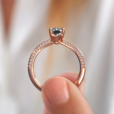 This 14 Carat rose gold ring is called Elenore rad and is set with 1.296 crt lab grown diamond. This exclusive rose gold pavé solitaire engagement ring is a true work of art! The ornaments are crafted with a lot of patience and great passion. In order to create this ring with great precision, this craft requires a keen eye and skilful hand. A challenge which ignites a fire in our expert goldsmith. The exquisite lab-grown diamonds are set in a special way so they stand out even more. This gives the ring an even more glamorous appearance. The graceful engagement ring is actually unique on its own because of the gemstones which we carefully select especially for this ring. On top of that you select the precious metals which will be used to create a unique ring for the most extraordinary woman in your life! This jewel is made with passion and love by one of our master goldsmiths.After receiving your order, our goldsmiths will start the creative process of making your Elenore rad engagement ring. We don't keep stock. This is advantageous because these costs will not be passed on to you. Therefore, we can offer jewellery at exceptionally low prices.Do you have a specific ring in mind? One you came across somewhere. Please feel free to tell us your wishes and we will turn your design into a unique engagement ring. You can follow the development of your ring design because we use 3D drawings. This gives you a realistic preview of your design. We will gladly send you a non-binding offer, based on a fair price/ quality ratio. It will amaze you.To make it easier for you, we offer a 30 day return policy. Check our terms and conditions.