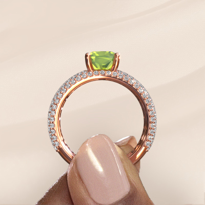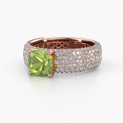 This 14 Carat rose gold ring is called Darcy and is set with 7 mm peridot. This exclusive rose gold pavé solitaire Engagement ring is a true work of art! The ornaments are crafted with a lot of patience and great passion. In order to create this ring with great precision, this craft requires a keen eye and skilful hand. A challenge which ignites a fire in our expert goldsmith. The exquisite peridot are set in a special way so they stand out even more. This gives the ring an even more glamorous appearance. The pavé Engagement ring is actually unique on its own because of the gemstones which we carefully select especially for this ring. On top of that you select the precious metals which will be used to create a unique ring for the most extraordinary woman in your life! This jewel is unique in every way! Simply customize to your likingBecause we design and deliver our own rings, we can offer you a Engagement ring at a price you won't find anywhere else. A ring is made to order, which helps prevent excess supplies, so we can make you a great price offer. We understand it feels risky, buying your Engagement ring online, but we will gladly assist in the designing process, taking your budget into consideration.Different styles of new rings are made daily by our team. Perhaps you have found a pavé solitaire Engagement ring somewhere. One you would like to give to your loved one. Please feel free to share your thoughts and design with our jewel designers. We would love to turn your design into a exclusive Engagement ring. You can follow the development of your ring design because we use very detailed 3D drawings. On top of that, you can order a dummy of the design. A dummy is a plastic ring, which can be shaped according your ring design. You can try it on and check if the Engagement ring is up to standard. We will gladly send you a non-binding offer, based on a fair price/ quality ratio. The offer will baffle you, considering the quality of the ring and gemstones.To make it easier for you, we offer a 30 day return policy. Check our terms and conditions.