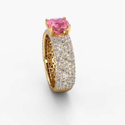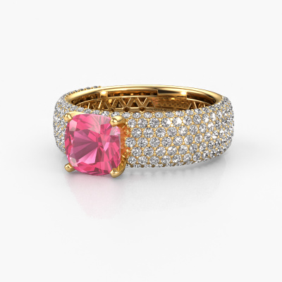 This 14 Carat gold ring is called Darcy and is set with 7 mm pink sapphire. This exclusive gold pavé solitaire Engagement ring is a true work of art! The ornaments are crafted with a lot of patience and great passion. In order to create this ring with great precision, this craft requires a keen eye and skilful hand. A challenge which ignites a fire in our expert goldsmith. The exquisite pink sapphire are set in a special way so they stand out even more. This gives the ring an even more glamorous appearance. The pavé Engagement ring is actually unique on its own because of the gemstones which we carefully select especially for this ring. On top of that you select the precious metals which will be used to create a unique ring for the most extraordinary woman in your life! This jewel is unique in every way! Simply customize to your likingBecause we design and deliver our own rings, we can offer you a Engagement ring at a price you won't find anywhere else. A ring is made to order, which helps prevent excess supplies, so we can make you a great price offer. We understand it feels risky, buying your Engagement ring online, but we will gladly assist in the designing process, taking your budget into consideration.Different styles of new rings are made daily by our team. Perhaps you have found a pavé solitaire Engagement ring somewhere. One you would like to give to your loved one. Please feel free to share your thoughts and design with our jewel designers. We would love to turn your design into a exclusive Engagement ring. You can follow the development of your ring design because we use very detailed 3D drawings. On top of that, you can order a dummy of the design. A dummy is a plastic ring, which can be shaped according your ring design. You can try it on and check if the Engagement ring is up to standard. We will gladly send you a non-binding offer, based on a fair price/ quality ratio. The offer will baffle you, considering the quality of the ring and gemstones.To make it easier for you, we offer a 30 day return policy. Check our terms and conditions.