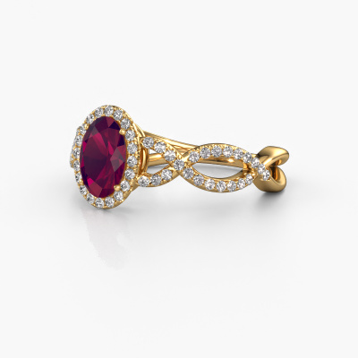 This 14 Carat gold ring is called Dionne ovl and is set with 7x5 mm rhodolite. This exclusive gold pavé solitaire engagement ring is a true work of art! The ornaments are crafted with a lot of patience and great passion. In order to create this ring with great precision, this craft requires a keen eye and skilful hand. A challenge which ignites a fire in our expert goldsmith. The exquisite rhodolite are set in a special way so they stand out even more. This gives the ring an even more glamorous appearance. The twisted engagement ring is actually unique on its own because of the gemstones which we carefully select especially for this ring. On top of that you select the precious metals which will be used to create a unique ring for the most extraordinary woman in your life! This jewel is unique in every way! Simply customize to your likingAfter receiving your order, our goldsmiths will start the creative process of making your Dionne ovl engagement ring. We don't keep stock. This is advantageous because these costs will not be passed on to you. Therefore, we can offer jewellery at exceptionally low prices.Different styles of new rings are made daily by our team. Perhaps you have found a pavé solitaire engagement ring somewhere. One you would like to give to your loved one. Please feel free to share your thoughts and design with our jewel designers. We would love to turn your design into a exclusive engagement ring. You can follow the development of your ring design because we use very detailed 3D drawings. On top of that, you can order a dummy of the design. A dummy is a plastic ring, which can be shaped according your ring design. You can try it on and check if the engagement ring is up to standard. We will gladly send you a non-binding offer, based on a fair price/ quality ratio. The offer will baffle you, considering the quality of the ring and gemstones.To make it easier for you, we offer a 30 day return policy. Check our terms and conditions.