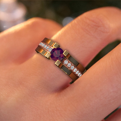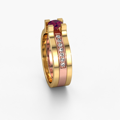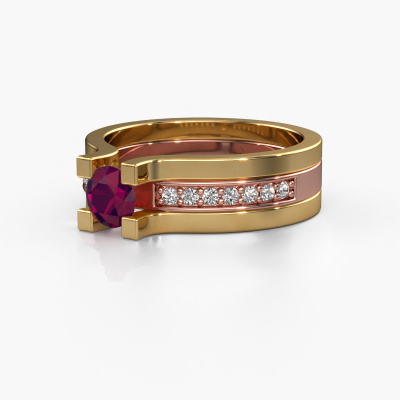 This 14 Carat rose gold ring is called Myrthe and is set with 5 mm rhodolite. This exclusive rose gold pavé solitaire engagement ring is a true work of art! The ornaments are crafted with a lot of patience and great passion. In order to create this ring with great precision, this craft requires a keen eye and skilful hand. A challenge which ignites a fire in our expert goldsmith. The exquisite rhodolite are set in a special way so they stand out even more. This gives the ring an even more glamorous appearance. The graceful engagement ring is actually unique on its own because of the gemstones which we carefully select especially for this ring. On top of that you select the precious metals which will be used to create a unique ring for the most extraordinary woman in your life! This jewel is made just for you, with attention to detail and design.After receiving your order, our goldsmiths will start the creative process of making your Myrthe engagement ring. We don't keep stock. This is advantageous because these costs will not be passed on to you. Therefore, we can offer jewellery at exceptionally low prices.Our designers and goldsmiths work together each day, creating new jewels. Perhaps you have found a nice modern engagement ring somewhere, which can be used to customize your unique ring. Please feel free to contact us. We will make you an offer, based on a fair price/ quality ratio, which will amaze you.To make it easier for you, we offer a 30 day return policy. Check our terms and conditions.
