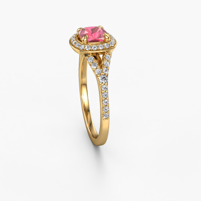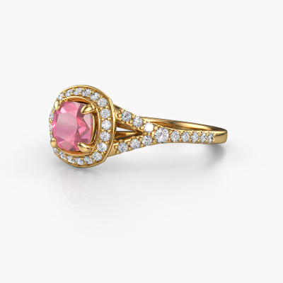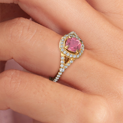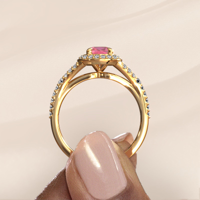 The ring shown above is called the Pamela CUS. We call this type of ring a halo ring because it has one centre gemstone and a band that is also pave set with gemstones. The 14 Carat gold engagement ring is set with a cushion 5.5 mm tourmaline pink centre stone and the band is pave set with lab-grown diamonds. What makes this luxury gold pavé solitaire ring special are the smaller sized stones embracing the centre stone. This gorgeous engagement ring is called a pavé solitaire ring because the smaller gemstones give the centre stone a pavé solitaire of surrounding light. In order for the smaller stones to enhance the centre stone, they have to be placed so there is no interference of light. And that's when our expert goldsmiths come in. Each individual stone is carefully set in the ring by hand. During manufacturing, light fall is constantly monitored to make sure the special pavé solitaire is still visible. In the end you get a unique engagement ring, with a tourmaline pink of your choosing at its centre. You can imagine the effect of a ring of such significance when you give it to her on her special day to shine. After receiving your order, our goldsmiths will passionately start the creative process of making your engagement ring in our own studio. Because we don't have a big stockpile, these costs will not be passed on to you. Our pricing is proof of that! We offer top quality jewels at lowest price, guaranteed.Different styles of new rings are made daily by our team. Perhaps you have found a pavé solitaire engagement ring somewhere. One you would like to give to your loved one. Please feel free to share your thoughts and design with our jewel designers. We would love to turn your design into a luxury engagement ring. You can follow the development of your ring design because we use very detailed 3D drawings. On top of that, you can order a dummy of the design. A dummy is a plastic ring, which can be shaped according your ring design. You can try it on and check if the engagement ring is up to standard. We will gladly send you a non-binding offer, based on a fair price/ quality ratio. The offer will baffle you, considering the quality of the ring and gemstones.To make it easier for you, we offer a 30 day return policy. Check our terms and conditions.