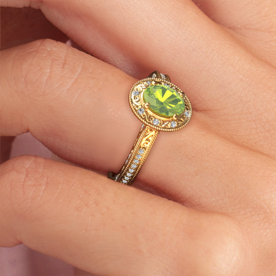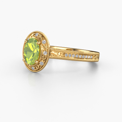 This 14 Carat gold ring is called Alice OVL and is set with 7x5 mm peridot. What is it that makes your relationship unique? What is it about her that makes you want to bend down on one knee? The unique bond between the two of you is emphasized by an equally unique ring. A one of a kind filigree halo engagement ring made especially for her. That is why this vintage ring fits her like a glove. Each specific detail of this filigree gold peridot set engagement ring is hand-picked, crafted and polished by our expert goldsmith. The result is an exquisite ring, unique and perfectly crafted to perfection. That is what our expert Goldsmiths strive for. This jewel is made with passion and love by one of our master goldsmiths.By using our modern techniques, we can design and customize the finest quality jewels with the utmost care for you. Our engagement rings are always priced 30 percent lower than other jewellers. We make engagement rings to order so we don't have to maintain a large stock. If you have a certain budget, we are more than happy to advice you accordingly.Our team adds new designs to our online collection daily. Our designers and goldsmiths work together in creating the best design. We strive to offer a diverse collection of jewels. Perhaps you have a specific jewel design in mind. One you came across somewhere. Please contact us for a free consultation. We will make you an offer, based on a fair price/ quality ratio, that will baffle you.To make it easier for you, we offer a 30 day return policy. Check our terms and conditions.