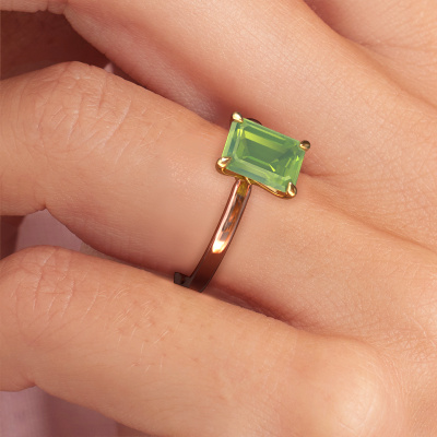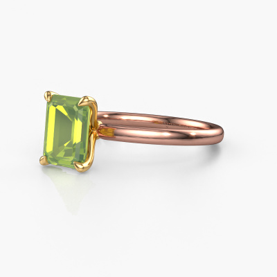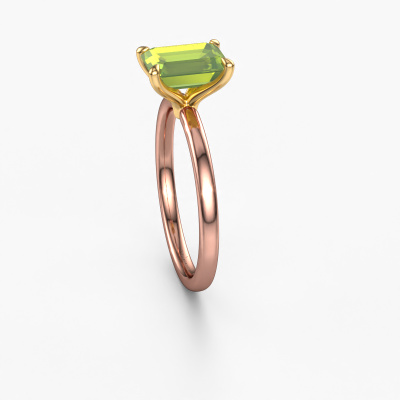 The ring shown above is called the Crystal EME 1, we call this a solitaire ring because it contains a single gemstone. The engagement ring is made in 14 Carat rose gold and has a emerald cut peridot of 8x6 mm. The cool thing about our configurator is that you can compile your own piece of jewellery, into a completely personalized one. This solitaire ring is crafted in the precious metals rose gold with gold, but of course you are free to pick your own colours. Each piece of jewellery is made with passion and love by one of our master goldsmiths.The solitaire ring is a special type of engagement ring. Its open prong setting allows light to strike the gemstone from various angles. This classic engagement ring is a stunning eye-catcher because of the high positioning of the gemstone. In order for you to commemorate your proposal with a unique ring, we carefully adorn this solitaire ring by hand. The love of your life deserves nothing but the best. After receiving your order, our goldsmiths will passionately start the creative process of making your engagement ring in our own studio. Because we don't have a big stockpile, these costs will not be passed on to you. Our pricing is proof of that! We offer top quality jewels at lowest price, guaranteed.Our designers and goldsmiths work together each day, creating new jewels. Perhaps you have found a nice classic engagement ring somewhere, which can be used to customize your unique ring. Please feel free to contact us. We will make you an offer, based on a fair price/ quality ratio, which will amaze you.To make it easier for you, we offer a 30 day return policy. Check our terms and conditions.