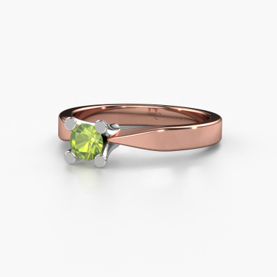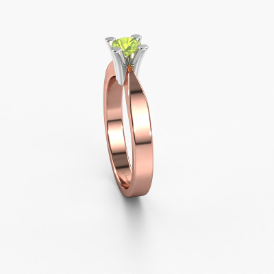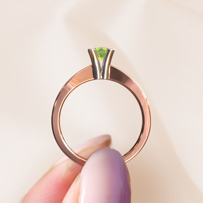 In your eyes, no one else compares to her. She is one in a million, unlike anyone else and pure? These qualities are emphasized perfectly by our traditional rose gold solitaire peridot ring. This peridot is carefully selected by our keen artisan goldsmiths. It equals the unique qualities of the love of your life. There is no better way to memorialize your proposal than this symbol of true love. The ring shown above is called the Ichelle 1, we call this a solitaire ring because it contains a single gemstone. The engagement ring is made in 14 Carat rose gold and has a round peridot of 4.2 mm. Each piece of jewellery is made with passion and love by one of our master goldsmiths.After receiving your order, our goldsmiths will start the creative process of making your Ichelle 1 engagement ring. We don't keep stock. This is advantageous because these costs will not be passed on to you. Therefore, we can offer jewellery at exceptionally low prices.Have you found a specific engagement ring somewhere which you would like to give to your loved one? Please feel free to express your wishes to our jewel designers because we would be honoured to turn your design into a traditional engagement ring. You can follow the development of your ring design because we use 3D drawings. This gives you a realistic preview of how your design will look. You can also preorder a dummy. A dummy is a plastic ring, which can be shaped according your ring design. You can try it on and check if its width and size are suitable for you. We will gladly send you a non-binding offer, based on a fair price/ quality ratio. It will amaze you, considering the quality of the ring and gemstones.To make it easier for you, we offer a 30 day return policy. Check our terms and conditions.