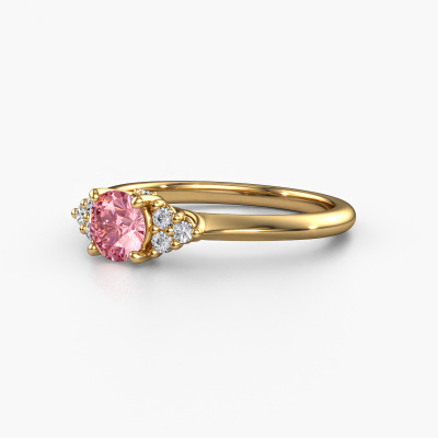 This 14 Carat gold ring is called Felipa RND and is set with 5 mm pink lab grown diamond. What is it that makes your relationship unique? What is it about her that makes you want to bend down on one knee? The unique bond between the two of you is emphasized by an equally unique ring. A one of a kind ajour 3-stone engagement ring made especially for her. That is why this fantasy ring fits her like a glove. Each specific detail of this ajour gold pink lab grown diamond set engagement ring is hand-picked, crafted and polished by our expert goldsmith. The result is an exquisite ring, unique and perfectly crafted to perfection. That is what our expert Goldsmiths strive for. This jewel is made just for you by our master goldsmiths in our own studio.After receiving your order, our goldsmiths will passionately start the creative process of making your engagement ring in our own studio. Because we don't have a big stockpile, these costs will not be passed on to you. Our pricing is proof of that! We offer top quality jewels at lowest price, guaranteed.Have you found a specific engagement ring somewhere which you would like to give to your loved one? Please feel free to express your wishes to our jewel designers because we would be honoured to turn your design into a fantasy engagement ring. You can follow the development of your ring design because we use 3D drawings. This gives you a realistic preview of how your design will look. You can also preorder a dummy. A dummy is a plastic ring, which can be shaped according your ring design. You can try it on and check if its width and size are suitable for you. We will gladly send you a non-binding offer, based on a fair price/ quality ratio. It will amaze you, considering the quality of the ring and gemstones.To make it easier for you, we offer a 30 day return policy. Check our terms and conditions.