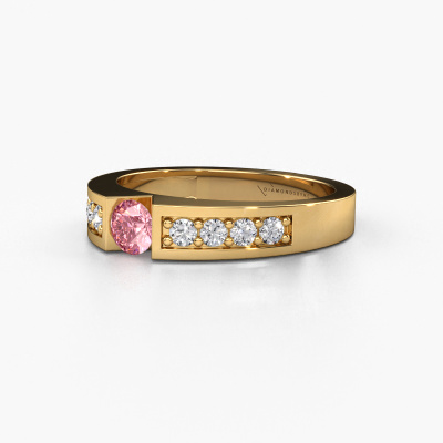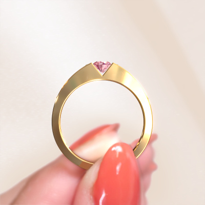 The ring shown above is called the Lizzy 2. We call this type of ring a pavé solitaire ring because it has one centre gemstone and a band that is also pave set with gemstones. This engagement ring is made in 14 Carat gold set with a 4.2 mm round pink lab grown diamond, and pave set diamonds at the sides. Each piece of jewellery is made to shine bright around your finger. Each jewel is hand made with love by our goldsmiths.This modern gold pavé solitaire engagement ring has an exquisite round pink lab grown diamond centre stone. To further accentuate the centre stone, the band is set full with more diamonds. Its open prong setting allows light to strike the pink lab grown diamond from various angles and this adds sparkle to your pink lab grown diamond ring. The photo shown above depicts the goldsmith's carefully handcrafted details of the ring. The high positioning of the centre stone is truly eye-catching. The perfect engagement ring for the crown jewel of your life!