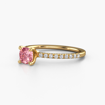 The ring shown above is called the Crystal CUS 2. We call this type of ring a pavé solitaire ring because it has one centre gemstone and a band that is also pave set with gemstones. The 14 Carat gold engagement ring is set with a cushion 5 mm pink lab grown diamond centre stone and the band is pave set with diamond gemstones. Each jewel is made just for you by our master goldsmiths in our own studio.This classic gold pavé solitaire engagement ring has an exquisite cushion pink lab grown diamond centre stone. To further accentuate the centre stone, the band is fully set with more diamonds. Its open prong setting allows light to strike the pink lab grown diamond from various angles and this adds sparkle to your pink lab grown diamond ring. The photo shown above depicts the goldsmith's carefully handcrafted details of the ring. The high positioning of the centre stone is truly eye-catching. The perfect engagement ring for the crown jewel of your life! After receiving your order, our goldsmiths will start the creative process of making your Crystal CUS 2 engagement ring. We don't keep stock. This is advantageous because these costs will not be passed on to you. Therefore, we can offer jewellery at exceptionally low prices.Different styles of new rings are made daily by our team. Perhaps you have found a pavé solitaire engagement ring somewhere. One you would like to give to your loved one. Please feel free to share your thoughts and design with our jewel designers. We would love to turn your design into a classic engagement ring. You can follow the development of your ring design because we use very detailed 3D drawings. On top of that, you can order a dummy of the design. A dummy is a plastic ring, which can be shaped according your ring design. You can try it on and check if the engagement ring is up to standard. We will gladly send you a non-binding offer, based on a fair price/ quality ratio. The offer will baffle you, considering the quality of the ring and gemstones.To make it easier for you, we offer a 30 day return policy. Check our terms and conditions.