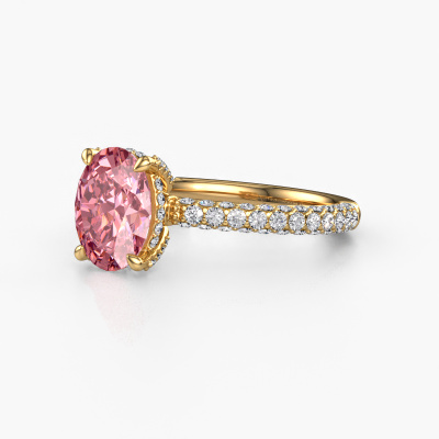 The ring shown above is called the Saskia 2 ovl. We call this type of ring a pavé solitaire ring because it has one centre gemstone and a band that is also pave set with gemstones. The 14 Carat gold engagement ring is set with a oval 9x7 mm pink lab grown diamond centre stone and the band is pave set with lab grown diamond gemstones. Each jewel is made just for you by our master goldsmiths in our own studio.This exclusive gold pavé solitaire engagement ring has an exquisite oval pink lab grown diamond centre stone. To further accentuate the centre stone, the band is fully set with more lab-grown diamonds. Its open prong setting allows light to strike the pink lab grown diamond from various angles and this adds sparkle to your pink lab grown diamond ring. The photo shown above depicts the goldsmith's carefully handcrafted details of the ring. The high positioning of the centre stone is truly eye-catching. The perfect engagement ring for the crown jewel of your life! After receiving your order, our goldsmiths will passionately start the creative process of making your engagement ring in our own studio. Because we don't have a big stockpile, these costs will not be passed on to you. Our pricing is proof of that! We offer top quality jewels at lowest price, guaranteed.Have you found a specific engagement ring somewhere which you would like to give to your loved one? Please feel free to express your wishes to our jewel designers because we would be honoured to turn your design into a exclusive engagement ring. You can follow the development of your ring design because we use 3D drawings. This gives you a realistic preview of how your design will look. You can also preorder a dummy. A dummy is a plastic ring, which can be shaped according your ring design. You can try it on and check if its width and size are suitable for you. We will gladly send you a non-binding offer, based on a fair price/ quality ratio. It will amaze you, considering the quality of the ring and gemstones.To make it easier for you, we offer a 30 day return policy. Check our terms and conditions.