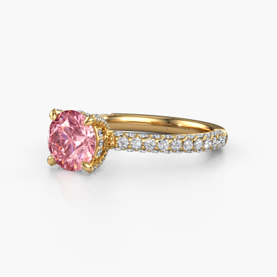 The ring shown above is called the Saskia rnd 2. We call this type of ring a pavé solitaire ring because it has one centre gemstone and a band that is also pave set with gemstones. The 14 Carat gold engagement ring is set with a round 7 mm pink lab grown diamond centre stone and the band is pave set with lab grown diamond gemstones. Each jewel is made by a team of passionate goldsmiths and jewel designers. This will make your crown jewel truly eye-catching.This exclusive gold pavé solitaire engagement ring has an exquisite round pink lab grown diamond centre stone. To further accentuate the centre stone, the band is fully set with more lab-grown diamonds. Its open prong setting allows light to strike the pink lab grown diamond from various angles and this adds sparkle to your pink lab grown diamond ring. The photo shown above depicts the goldsmith's carefully handcrafted details of the ring. The high positioning of the centre stone is truly eye-catching. The perfect engagement ring for the crown jewel of your life! After receiving your order, our goldsmiths will passionately start the creative process of making your engagement ring in our own studio. Because we don't have a big stockpile, these costs will not be passed on to you. Our pricing is proof of that! We offer top quality jewels at lowest price, guaranteed.Our team adds new designs to our online collection daily. Our designers and goldsmiths work together in creating the best design. We strive to offer a diverse collection of jewels. Perhaps you have a specific jewel design in mind. One you came across somewhere. Please contact us for a free consultation. We will make you an offer, based on a fair price/ quality ratio, that will baffle you.To make it easier for you, we offer a 30 day return policy. Check our terms and conditions.