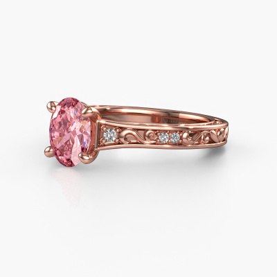 The ring shown above is called the Mallory ovl. We call this type of ring a pavé solitaire ring because it has one centre gemstone and a band that is also pave set with gemstones. This engagement ring is made in 14 Carat rose gold set with a 8x6 mm oval pink lab grown diamond, and pave set lab-grown diamonds at the sides. Each piece of jewellery is made with passion and love by one of our master goldsmiths.This traditional rose gold pavé solitaire engagement ring has an exquisite oval pink lab grown diamond centre stone. To further accentuate the centre stone, the band is set full with more lab-grown diamonds. Its open prong setting allows light to strike the pink lab grown diamond from various angles and this adds sparkle to your pink lab grown diamond ring. The photo shown above depicts the goldsmith's carefully handcrafted details of the ring. The high positioning of the centre stone is truly eye-catching. The perfect engagement ring for the crown jewel of your life!Are you on a budget? Please feel free to contact us, so we can go discuss your options. We offer our engagement rings at guaranteed best price, because we make them to order. You won't find such a price anywhere else!Our team adds new designs to our online collection daily. Our designers and goldsmiths work together in creating the best design. We strive to offer a diverse collection of jewels. Perhaps you have a specific jewel design in mind. One you came across somewhere. Please contact us for a free consultation. We will make you an offer, based on a fair price/ quality ratio, that will baffle you.To make it easier for you, we offer a 30 day return policy. Check our terms and conditions.