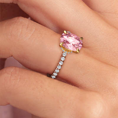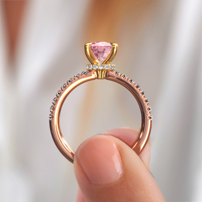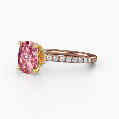 The ring shown above is called the Crystal CSH 4. We call this type of ring a pavé solitaire ring because it has one centre gemstone and a band that is also pave set with gemstones. The 14 Carat rose gold engagement ring is set with a cushion rectangle 8x6 mm pink lab grown diamond centre stone and the band is pave set with lab grown diamond gemstones. Each jewel is made with passion and love by one of our master goldsmiths.This chic rose gold pavé solitaire engagement ring has an exquisite cushion rectangle pink lab grown diamond centre stone. To further accentuate the centre stone, the band is fully set with more lab-grown diamonds. Its open prong setting allows light to strike the pink lab grown diamond from various angles and this adds sparkle to your pink lab grown diamond ring. The photo shown above depicts the goldsmith's carefully handcrafted details of the ring. The high positioning of the centre stone is truly eye-catching. The perfect engagement ring for the crown jewel of your life! By using a combination of the latest modern techniques, combined with ancient crafting, we can make all our engagement rings in our own studio. Each jewel is made to order. This is advantageous because we can offer you a price you won't find anywhere else.Our designers and goldsmiths work together each day, creating new jewels. Perhaps you have found a nice chic engagement ring somewhere, which can be used to customize your unique ring. Please feel free to contact us. We will make you an offer, based on a fair price/ quality ratio, which will amaze you.To make it easier for you, we offer a 30 day return policy. Check our terms and conditions.
