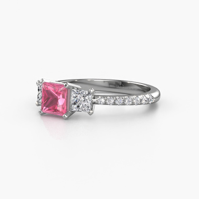 This platinum ring is called Dorla and is set with 5 mm pink sapphire. What is it that makes your relationship unique? What is it about her that makes you want to bend down on one knee? The unique bond between the two of you is emphasized by an equally unique ring. A one of a kind micro pave 3-stone engagement ring made especially for her. That is why this exclusive ring fits her like a glove. Each specific detail of this micro pave platinum pink sapphire set engagement ring is hand-picked, crafted and polished by our expert goldsmith. The result is an exquisite ring, unique and perfectly crafted to perfection. That is what our expert Goldsmiths strive for. This jewel is unique in every way! Simply customize to your liking,After receiving your order, our goldsmiths will passionately start the creative process of making your engagement ring in our own studio. Because we don't have a big stockpile, these costs will not be passed on to you. Our pricing is proof of that! We offer top quality jewels at lowest price, guaranteed.Do you have a specific ring in mind? One you came across somewhere. Please feel free to tell us your wishes and we will turn your design into a unique engagement ring. You can follow the development of your ring design because we use 3D drawings. This gives you a realistic preview of your design. We will gladly send you a non-binding offer, based on a fair price/ quality ratio. It will amaze you.To make it easier for you, we offer a 30 day return policy. Check our terms and conditions.