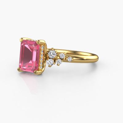 The ring shown above is called the Emma EME. We call this type of ring a pavé solitaire ring because it has one centre gemstone and a band that is also pave set with gemstones. This engagement ring is made in 14 Carat gold set with a 8x6 mm emerald cut pink sapphire, and pave set lab-grown diamonds at the sides. Each piece of jewellery is made with passion and love by one of our master goldsmiths.This fantasy gold pavé solitaire engagement ring has an exquisite emerald cut pink sapphire centre stone. To further accentuate the centre stone, the band is set full with more lab-grown diamonds. Its open prong setting allows light to strike the pink sapphire from various angles and this adds sparkle to your pink sapphire ring. The photo shown above depicts the goldsmith's carefully handcrafted details of the ring. The high positioning of the centre stone is truly eye-catching. The perfect engagement ring for the crown jewel of your life!After receiving your order, our goldsmiths will passionately start the creative process of making your engagement ring in our own studio. Because we don't have a big stockpile, these costs will not be passed on to you. Our pricing is proof of that! We offer top quality jewels at lowest price, guaranteed.Our team adds new designs to our online collection daily. Our designers and goldsmiths work together in creating the best design. We strive to offer a diverse collection of jewels. Perhaps you have a specific jewel design in mind. One you came across somewhere. Please contact us for a free consultation. We will make you an offer, based on a fair price/ quality ratio, that will baffle you.To make it easier for you, we offer a 30 day return policy. Check our terms and conditions.