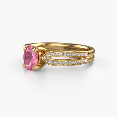 The ring shown above is called the Antonia ovl 2. We call this type of ring a pavé solitaire ring because it has one centre gemstone and a band that is also pave set with gemstones. The 14 Carat gold engagement ring is set with a oval 7x5 mm pink sapphire centre stone and the band is pave set with diamond gemstones. Each jewel is unique in every way! Simply customize to your liking,This contemporary gold pavé solitaire engagement ring has an exquisite oval pink sapphire centre stone. To further accentuate the centre stone, the band is fully set with more diamonds. Its open prong setting allows light to strike the pink sapphire from various angles and this adds sparkle to your pink sapphire ring. The photo shown above depicts the goldsmith's carefully handcrafted details of the ring. The high positioning of the centre stone is truly eye-catching. The perfect engagement ring for the crown jewel of your life! By using a combination of the latest modern techniques, combined with ancient crafting, we can make all our engagement rings in our own studio. Each jewel is made to order. This is advantageous because we can offer you a price you won't find anywhere else.Our team adds new designs to our online collection daily. Our designers and goldsmiths work together in creating the best design. We strive to offer a diverse collection of jewels. Perhaps you have a specific jewel design in mind. One you came across somewhere. Please contact us for a free consultation. We will make you an offer, based on a fair price/ quality ratio, that will baffle you.To make it easier for you, we offer a 30 day return policy. Check our terms and conditions.
