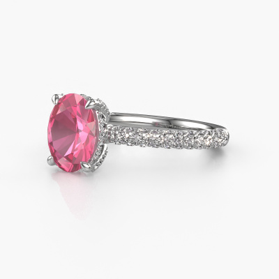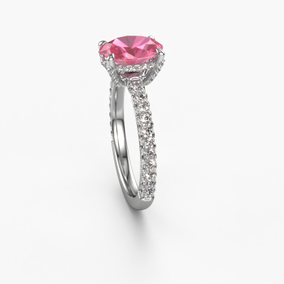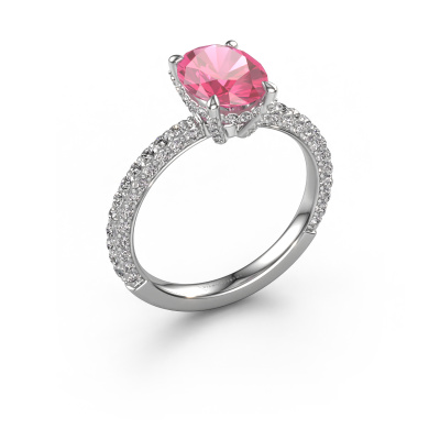 The ring shown above is called the Saskia 2 ovl. We call this type of ring a pavé solitaire ring because it has one centre gemstone and a band that is also pave set with gemstones. The platinum engagement ring is set with a oval 9x7 mm pink sapphire centre stone and the band is pave set with lab grown diamond gemstones. Each jewel is made just for you by our master goldsmiths in our own studio.This exclusive platinum pavé solitaire engagement ring has an exquisite oval pink sapphire centre stone. To further accentuate the centre stone, the band is fully set with more lab-grown diamonds. Its open prong setting allows light to strike the pink sapphire from various angles and this adds sparkle to your pink sapphire ring. The photo shown above depicts the goldsmith's carefully handcrafted details of the ring. The high positioning of the centre stone is truly eye-catching. The perfect engagement ring for the crown jewel of your life! After receiving your order, our goldsmiths will passionately start the creative process of making your engagement ring in our own studio. Because we don't have a big stockpile, these costs will not be passed on to you. Our pricing is proof of that! We offer top quality jewels at lowest price, guaranteed.Have you found a specific engagement ring somewhere which you would like to give to your loved one? Please feel free to express your wishes to our jewel designers because we would be honoured to turn your design into a exclusive engagement ring. You can follow the development of your ring design because we use 3D drawings. This gives you a realistic preview of how your design will look. You can also preorder a dummy. A dummy is a plastic ring, which can be shaped according your ring design. You can try it on and check if its width and size are suitable for you. We will gladly send you a non-binding offer, based on a fair price/ quality ratio. It will amaze you, considering the quality of the ring and gemstones.To make it easier for you, we offer a 30 day return policy. Check our terms and conditions.