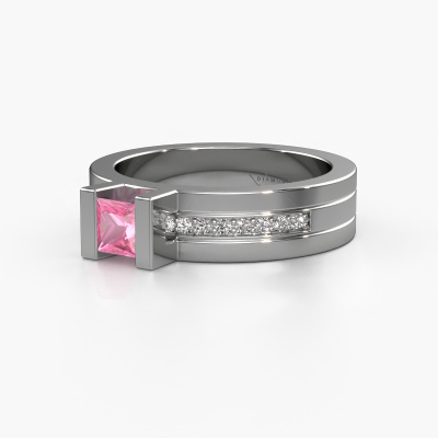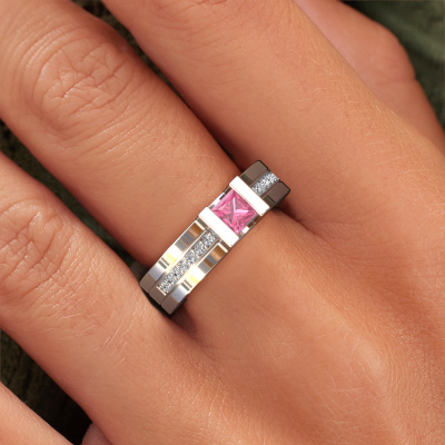 The ring shown above is called the Desire. We call this type of ring a pavé solitaire ring because it has one centre gemstone and a band that is also pave set with gemstones. The 14 Carat white gold engagement ring is set with a princess 4 mm pink sapphire centre stone and the band is pave set with diamond gemstones. Each jewel is made just for you by our master goldsmiths in our own studio.This modern white gold pavé solitaire engagement ring has an exquisite princess pink sapphire centre stone. To further accentuate the centre stone, the band is fully set with more diamonds. Its open prong setting allows light to strike the pink sapphire from various angles and this adds sparkle to your pink sapphire ring. The photo shown above depicts the goldsmith's carefully handcrafted details of the ring. The high positioning of the centre stone is truly eye-catching. The perfect engagement ring for the crown jewel of your life! By using a combination of the latest modern techniques, combined with ancient crafting, we can make all our engagement rings in our own studio. Each jewel is made to order. This is advantageous because we can offer you a price you won't find anywhere else.Have you found a specific engagement ring somewhere which you would like to give to your loved one? Please feel free to express your wishes to our jewel designers because we would be honoured to turn your design into a modern engagement ring. You can follow the development of your ring design because we use 3D drawings. This gives you a realistic preview of how your design will look. You can also preorder a dummy. A dummy is a plastic ring, which can be shaped according your ring design. You can try it on and check if its width and size are suitable for you. We will gladly send you a non-binding offer, based on a fair price/ quality ratio. It will amaze you, considering the quality of the ring and gemstones.To make it easier for you, we offer a 30 day return policy. Check our terms and conditions.