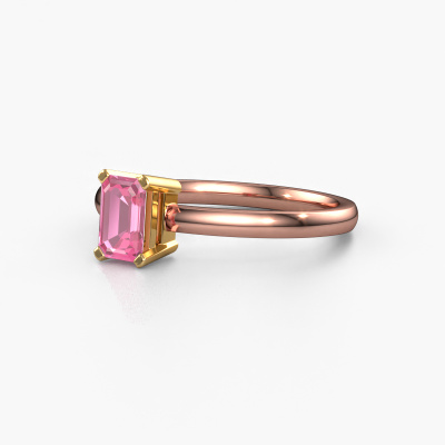 The ring shown above is called the Denita 1 EME, we call this a solitaire ring because it contains a single gemstone. The engagement ring is made in 14 Carat rose gold and has a emerald cut pink sapphire of 6x4 mm. The cool thing about our configurator is that you can compile your own piece of jewellery, into a completely personalized one. This solitaire ring is crafted in the precious metals rose gold with gold, but of course you are free to pick your own colours. Each piece of jewellery is made by a team of passionate goldsmiths and jewel designers. This will make your crown jewel truly eye-catching.The solitaire ring is a special type of engagement ring. Its open prong setting allows light to strike the gemstone from various angles. This contemporary engagement ring is a stunning eye-catcher because of the high positioning of the gemstone. In order for you to commemorate your proposal with a unique ring, we carefully adorn this solitaire ring by hand. The love of your life deserves nothing but the best. By using a combination of the latest modern techniques, combined with ancient crafting, we can make all our engagement rings in our own studio. Each jewel is made to order. This is advantageous because we can offer you a price you won't find anywhere else.Our team adds new designs to our online collection daily. Our designers and goldsmiths work together in creating the best design. We strive to offer a diverse collection of jewels. Perhaps you have a specific jewel design in mind. One you came across somewhere. Please contact us for a free consultation. We will make you an offer, based on a fair price/ quality ratio, that will baffle you.To make it easier for you, we offer a 30 day return policy. Check our terms and conditions.