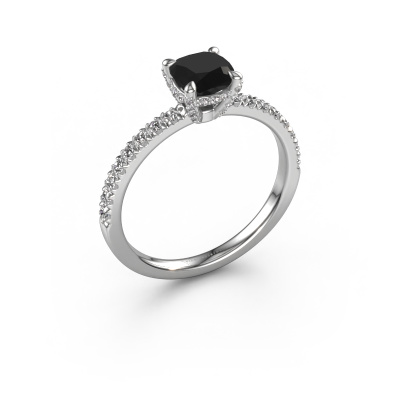 The ring shown above is called the Saskia 1 cus. We call this type of ring a pavé solitaire ring because it has one centre gemstone and a band that is also pave set with gemstones. The platinum engagement ring is set with a cushion 1.15 crt black diamond centre stone and the band is pave set with diamond gemstones. Each jewel is made by a team of passionate goldsmiths and jewel designers. This will make your crown jewel truly eye-catching.This unique platinum pavé solitaire engagement ring has an exquisite cushion black diamond centre stone. To further accentuate the centre stone, the band is fully set with more diamonds. Its open prong setting allows light to strike the black diamond from various angles and this adds sparkle to your black diamond ring. The photo shown above depicts the goldsmith's carefully handcrafted details of the ring. The high positioning of the centre stone is truly eye-catching. The perfect engagement ring for the crown jewel of your life! By using a combination of the latest modern techniques, combined with ancient crafting, we can make all our engagement rings in our own studio. Each jewel is made to order. This is advantageous because we can offer you a price you won't find anywhere else.Our team adds new designs to our online collection daily. Our designers and goldsmiths work together in creating the best design. We strive to offer a diverse collection of jewels. Perhaps you have a specific jewel design in mind. One you came across somewhere. Please contact us for a free consultation. We will make you an offer, based on a fair price/ quality ratio, that will baffle you.To make it easier for you, we offer a 30 day return policy. Check our terms and conditions.
