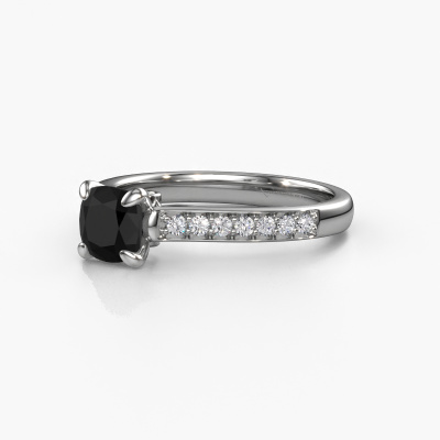 The ring shown above is called the Valorie cus 2. We call this type of ring a pavé solitaire ring because it has one centre gemstone and a band that is also pave set with gemstones. The platinum engagement ring is set with a cushion 1.15 crt black diamond centre stone and the band is pave set with diamond gemstones. Each jewel is made just for you by our master goldsmiths in our own studio.This traditional platinum pavé solitaire engagement ring has an exquisite cushion black diamond centre stone. To further accentuate the centre stone, the band is fully set with more diamonds. Its open prong setting allows light to strike the black diamond from various angles and this adds sparkle to your black diamond ring. The photo shown above depicts the goldsmith's carefully handcrafted details of the ring. The high positioning of the centre stone is truly eye-catching. The perfect engagement ring for the crown jewel of your life! By using a combination of the latest modern techniques, combined with ancient crafting, we can make all our engagement rings in our own studio. Each jewel is made to order. This is advantageous because we can offer you a price you won't find anywhere else.Our designers and goldsmiths work together each day, creating new jewels. Perhaps you have found a nice traditional engagement ring somewhere, which can be used to customize your unique ring. Please feel free to contact us. We will make you an offer, based on a fair price/ quality ratio, which will amaze you.To make it easier for you, we offer a 30 day return policy. Check our terms and conditions.