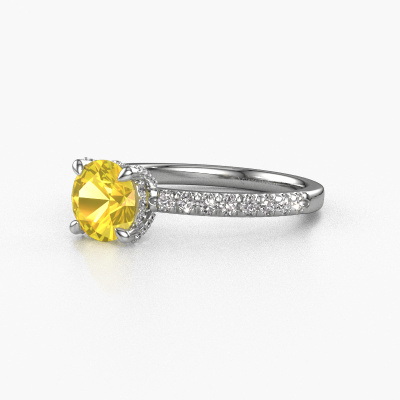The ring shown above is called the Saskia rnd 1. We call this type of ring a pavé solitaire ring because it has one centre gemstone and a band that is also pave set with gemstones. The platinum engagement ring is set with a round 6.5 mm yellow sapphire centre stone and the band is pave set with lab grown diamond gemstones. Each jewel is made with passion and love by one of our master goldsmiths.This exclusive platinum pavé solitaire engagement ring has an exquisite round yellow sapphire centre stone. To further accentuate the centre stone, the band is fully set with more lab-grown diamonds. Its open prong setting allows light to strike the yellow sapphire from various angles and this adds sparkle to your yellow sapphire ring. The photo shown above depicts the goldsmith's carefully handcrafted details of the ring. The high positioning of the centre stone is truly eye-catching. The perfect engagement ring for the crown jewel of your life! By using a combination of the latest modern techniques, combined with ancient crafting, we can make all our engagement rings in our own studio. Each jewel is made to order. This is advantageous because we can offer you a price you won't find anywhere else.Do you have a specific ring in mind? One you came across somewhere. Please feel free to tell us your wishes and we will turn your design into a unique engagement ring. You can follow the development of your ring design because we use 3D drawings. This gives you a realistic preview of your design. We will gladly send you a non-binding offer, based on a fair price/ quality ratio. It will amaze you.To make it easier for you, we offer a 30 day return policy. Check our terms and conditions.