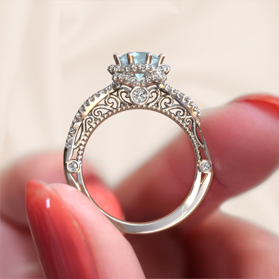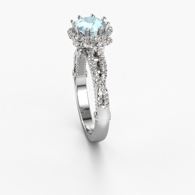 This platinum ring is called Lysanne and is set with 6.5 mm aquamarine. This filigree platinum engagement ring is a true work of art! A beautifully adorned design of intricate wires. With dedication, patience and the utmost precision, our expert goldsmith will design a ring just for you. The adornment of small wiring is crafted to perfection by hand. It's a lengthy process which includes welding, crafting and polishing until our Goldsmiths are completely satisfied with the result: a perfect eye-catching ring that makes her shine with delight. Therefore the vintage filigree engagement ring is an extraordinary gift to bestow upon the love of your life. A handmade one-of-a-kind personalized ring, to be given to that special someone on that special moment when you pop the question. Isn't that wonderful? This piece of jewellery is made by a team of passionate goldsmiths and jewel designers. This will make your crown jewel truly eye-catching.After receiving your order, our goldsmiths will start the creative process of making your Lysanne engagement ring. We don't keep stock. This is advantageous because these costs will not be passed on to you. Therefore, we can offer jewellery at exceptionally low prices.Have you found a specific engagement ring somewhere which you would like to give to your loved one? Please feel free to express your wishes to our jewel designers because we would be honoured to turn your design into a vintage engagement ring. You can follow the development of your ring design because we use 3D drawings. This gives you a realistic preview of how your design will look. You can also preorder a dummy. A dummy is a plastic ring, which can be shaped according your ring design. You can try it on and check if its width and size are suitable for you. We will gladly send you a non-binding offer, based on a fair price/ quality ratio. It will amaze you, considering the quality of the ring and gemstones.To make it easier for you, we offer a 30 day return policy. Check our terms and conditions.