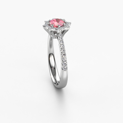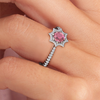This platinum ring is called Zena and is set with tourmaline pink. An extraordinary platinum vintage ring. One that will surely make the love of your life shine like a diamond! That is what we hope to achieve. This fantasy engagement ring is set