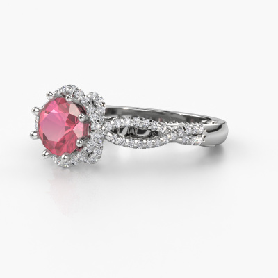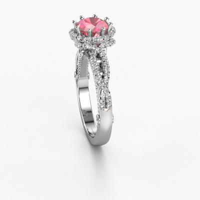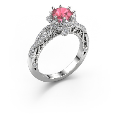 This platinum ring is called Lysanne and is set with 6.5 mm tourmaline pink. This filigree platinum engagement ring is a true work of art! A beautifully adorned design of intricate wires. With dedication, patience and the utmost precision, our expert goldsmith will design a ring just for you. The adornment of small wiring is crafted to perfection by hand. It's a lengthy process which includes welding, crafting and polishing until our Goldsmiths are completely satisfied with the result: a perfect eye-catching ring that makes her shine with delight. Therefore the vintage filigree engagement ring is an extraordinary gift to bestow upon the love of your life. A handmade one-of-a-kind personalized ring, to be given to that special someone on that special moment when you pop the question. Isn't that wonderful? This piece of jewellery is made by a team of passionate goldsmiths and jewel designers. This will make your crown jewel truly eye-catching.After receiving your order, our goldsmiths will start the creative process of making your Lysanne engagement ring. We don't keep stock. This is advantageous because these costs will not be passed on to you. Therefore, we can offer jewellery at exceptionally low prices.Have you found a specific engagement ring somewhere which you would like to give to your loved one? Please feel free to express your wishes to our jewel designers because we would be honoured to turn your design into a vintage engagement ring. You can follow the development of your ring design because we use 3D drawings. This gives you a realistic preview of how your design will look. You can also preorder a dummy. A dummy is a plastic ring, which can be shaped according your ring design. You can try it on and check if its width and size are suitable for you. We will gladly send you a non-binding offer, based on a fair price/ quality ratio. It will amaze you, considering the quality of the ring and gemstones.To make it easier for you, we offer a 30 day return policy. Check our terms and conditions.