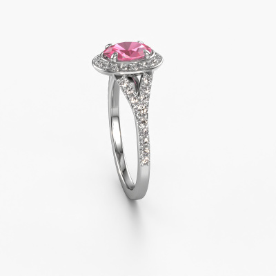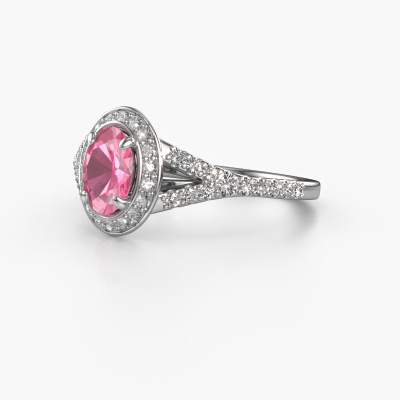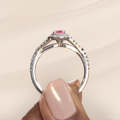 The ring shown above is called the Pamela OVL. We call this type of ring a halo ring because it has one centre gemstone and a band that is also pave set with gemstones. The platinum engagement ring is set with a oval 7x5 mm pink sapphire centre stone and the band is pave set with lab-grown diamonds. What makes this luxury platinum halo ring special are the smaller sized stones embracing the centre stone. This gorgeous engagement ring is called a halo ring because the smaller gemstones give the centre stone a halo of surrounding light. In order for the smaller stones to enhance the centre stone, they have to be placed so there is no interference of light. And that's when our expert goldsmiths come in. Each individual stone is carefully set in the ring by hand. During manufacturing, light fall is constantly monitored to make sure the special halo is still visible. In the end you get a unique engagement ring, with a pink sapphire of your choosing at its centre. You can imagine the effect of a ring of such significance when you give it to her on her special day to shine. By using our modern techniques, we can design and customize the finest quality jewels with the utmost care for you. Our engagement rings are always priced 30 percent lower than other jewellers. We make engagement rings to order so we don't have to maintain a large stock. If you have a certain budget, we are more than happy to advice you accordingly.Our team adds new designs to our online collection daily. Our designers and goldsmiths work together in creating the best design. We strive to offer a diverse collection of jewels. Perhaps you have a specific jewel design in mind. One you came across somewhere. Please contact us for a free consultation. We will make you an offer, based on a fair price/ quality ratio, that will baffle you.To make it easier for you, we offer a 30 day return policy. Check our terms and conditions.