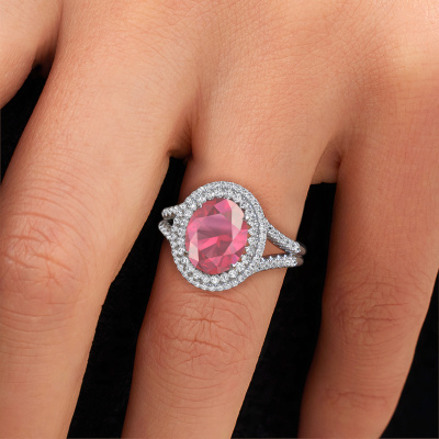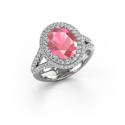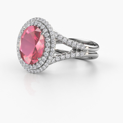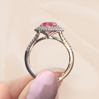 The ring shown above is called the Elvie. We call this type of ring a halo ring because it has one centre gemstone and a band that is also pave set with gemstones. The platinum engagement ring is set with a oval 10x8 mm tourmaline pink centre stone and the band is pave set with lab-grown diamonds. What makes this vintage platinum pavé solitaire ring special are the smaller sized stones embracing the centre stone. This gorgeous engagement ring is called a pavé solitaire ring because the smaller gemstones give the centre stone a pavé solitaire of surrounding light. In order for the smaller stones to enhance the centre stone, they have to be placed so there is no interference of light. And that's when our expert goldsmiths come in. Each individual stone is carefully set in the ring by hand. During manufacturing, light fall is constantly monitored to make sure the special pavé solitaire is still visible. In the end you get a unique engagement ring, with a tourmaline pink of your choosing at its centre. You can imagine the effect of a ring of such significance when you give it to her on her special day to shine. By using our modern techniques, we can design and customize the finest quality jewels with the utmost care for you. Our engagement rings are always priced 30 percent lower than other jewellers. We make engagement rings to order so we don't have to maintain a large stock. If you have a certain budget, we are more than happy to advice you accordingly.Do you have a specific ring in mind? One you came across somewhere. Please feel free to tell us your wishes and we will turn your design into a unique engagement ring. You can follow the development of your ring design because we use 3D drawings. This gives you a realistic preview of your design. We will gladly send you a non-binding offer, based on a fair price/ quality ratio. It will amaze you.To make it easier for you, we offer a 30 day return policy. Check our terms and conditions.