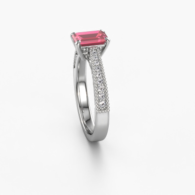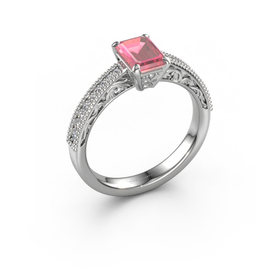 This platinum ring is called Shonta EME and is set with tourmaline pink. An extraordinary platinum vintage ring. One that will surely make the love of your life shine like a diamond! That is what we hope to achieve. This vintage engagement ring is set with exquisite tourmaline pink. Whichever gemstone you choose from our selection, is up to you. The gemstone is selected with great care because we believe your engagement ring must be adorned with nothing but the most beautiful gemstone. Wouldn't you agree? Our expert goldsmith will design your ring in our own artisan studio, where the tourmaline pink will be set with great precision. The ring will then be polished till it is absolutely perfect. Nothing but the best for the love of your life! This jewel is made by a team of passionate goldsmiths and jewel designers. This will make your crown jewel truly eye-catching.Are you on a budget? Please feel free to contact us, so we can go discuss your options. We offer our engagement rings at guaranteed best price, because we make them to order. You won't find such a price anywhere else!Have you found a specific engagement ring somewhere which you would like to give to your loved one? Please feel free to express your wishes to our jewel designers because we would be honoured to turn your design into a vintage engagement ring. You can follow the development of your ring design because we use 3D drawings. This gives you a realistic preview of how your design will look. You can also preorder a dummy. A dummy is a plastic ring, which can be shaped according your ring design. You can try it on and check if its width and size are suitable for you. We will gladly send you a non-binding offer, based on a fair price/ quality ratio. It will amaze you, considering the quality of the ring and gemstones.To make it easier for you, we offer a 30 day return policy. Check our terms and conditions.