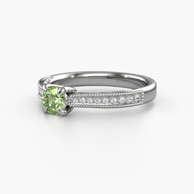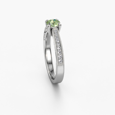 This platinum ring is called Shonta RND and is set with 4.7 mm green lab grown diamond. This filigree platinum engagement ring is a true work of art! A beautifully adorned design of intricate wires. With dedication, patience and the utmost precision, our expert goldsmith will design a ring just for you. The adornment of small wiring is crafted to perfection by hand. It's a lengthy process which includes welding, crafting and polishing until our Goldsmiths are completely satisfied with the result: a perfect eye-catching ring that makes her shine with delight. Therefore the vintage filigree engagement ring is an extraordinary gift to bestow upon the love of your life. A handmade one-of-a-kind personalized ring, to be given to that special someone on that special moment when you pop the question. Isn't that wonderful? This piece of jewellery is made just for you by our master goldsmiths in our own studio.