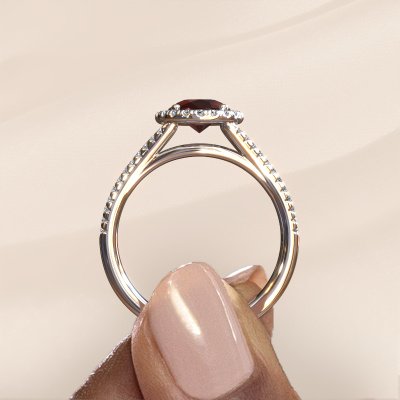 The ring shown above is called the Verla pear 2. We call this type of ring a halo ring because it has one centre gemstone and a band that is also pave set with gemstones. The platinum engagement ring is set with a pear 8x6 mm garnet centre stone and the band is pave set with diamonds. What makes this exclusive platinum halo ring special are the smaller sized stones embracing the centre stone. This gorgeous engagement ring is called a halo ring because the smaller gemstones give the centre stone a halo of surrounding light. In order for the smaller stones to enhance the centre stone, they have to be placed so there is no interference of light. And that's when our expert goldsmiths come in. Each individual stone is carefully set in the ring by hand. During manufacturing, light fall is constantly monitored to make sure the special halo is still visible. In the end you get a unique engagement ring, with a garnet of your choosing at its centre. You can imagine the effect of a ring of such significance when you give it to her on her special day to shine. After receiving your order, our goldsmiths will passionately start the creative process of making your engagement ring in our own studio. Because we don't have a big stockpile, these costs will not be passed on to you. Our pricing is proof of that! We offer top quality jewels at lowest price, guaranteed.Our designers and goldsmiths work together each day, creating new jewels. Perhaps you have found a nice exclusive engagement ring somewhere, which can be used to customize your unique ring. Please feel free to contact us. We will make you an offer, based on a fair price/ quality ratio, which will amaze you.To make it easier for you, we offer a 30 day return policy. Check our terms and conditions.