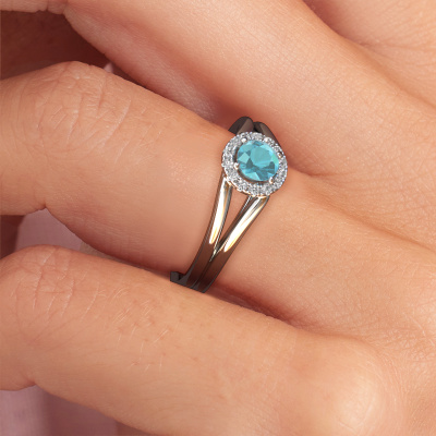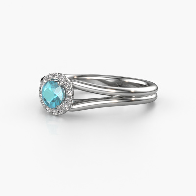 The ring shown above is called the Verla rnd 1. We call this type of ring a halo ring because it has one centre gemstone and a band that is also pave set with gemstones. The platinum engagement ring is set with a round 4.7 mm blue topaz centre stone and the band is pave set with diamonds. What makes this classic platinum halo ring special are the smaller sized stones embracing the centre stone. This gorgeous engagement ring is called a halo ring because the smaller gemstones give the centre stone a halo of surrounding light. In order for the smaller stones to enhance the centre stone, they have to be placed so there is no interference of light. And that's when our expert goldsmiths come in. Each individual stone is carefully set in the ring by hand. During manufacturing, light fall is constantly monitored to make sure the special halo is still visible. In the end you get a unique engagement ring, with a blue topaz of your choosing at its centre. You can imagine the effect of a ring of such significance when you give it to her on her special day to shine. By using a combination of the latest modern techniques, combined with ancient crafting, we can make all our engagement rings in our own studio. Each jewel is made to order. This is advantageous because we can offer you a price you won't find anywhere else.Our team adds new designs to our online collection daily. Our designers and goldsmiths work together in creating the best design. We strive to offer a diverse collection of jewels. Perhaps you have a specific jewel design in mind. One you came across somewhere. Please contact us for a free consultation. We will make you an offer, based on a fair price/ quality ratio, that will baffle you.To make it easier for you, we offer a 30 day return policy. Check our terms and conditions.