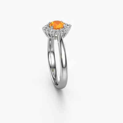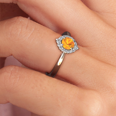 The ring shown above is called the Tora. We call this type of ring a cluster ring, the centre gemstone is surrounded by smaller sized stones. This platinum version is set with a 5 mm round citrin centre stone, embraced by smaller lab-grown diamonds. The classic platinum cluster engagement ring stands out because of its shape. Together, the smaller and bigger sized citrin gemstones form a flower and they appear to collide into one big sparkling gem. This classic engagement ring is also known as the flower ring. Our expert Goldsmiths make sure the smaller lab-grown diamonds stones are set identically so there is no light interference in the citrin but unity instead. With perfect precision and a skilful hand each citrin is set in the ring. During manufacturing, it is constantly monitored to make sure light reflects flawlessly. This results in a unique engagement ring, with a radiant citrin at its centre. A lovely, meaningful gift to bestow upon the love of your life. By using a combination of the latest modern techniques, combined with ancient crafting, we can make all our engagement rings in our own studio. Each jewel is made to order. This is advantageous because we can offer you a price you won't find anywhere else.Have you found a specific engagement ring somewhere which you would like to give to your loved one? Please feel free to express your wishes to our jewel designers because we would be honoured to turn your design into a classic engagement ring. You can follow the development of your ring design because we use 3D drawings. This gives you a realistic preview of how your design will look. You can also preorder a dummy. A dummy is a plastic ring, which can be shaped according your ring design. You can try it on and check if its width and size are suitable for you. We will gladly send you a non-binding offer, based on a fair price/ quality ratio. It will amaze you, considering the quality of the ring and gemstones.To make it easier for you, we offer a 30 day return policy. Check our terms and conditions.