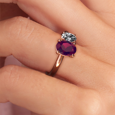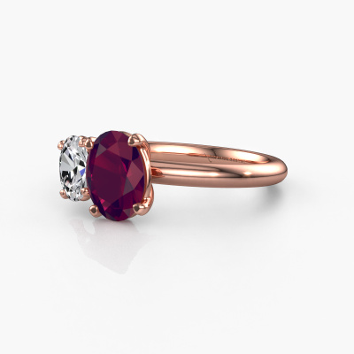 This 14 Carat rose gold ring is called Toi et Moi OVL-OVL and is set with rhodolite. How would you describe the style of the love of your life? Does she have a unique sense of style? This stunning sublime rose gold engagement ring can be custom-made to your own or her liking. Our rhodolite gemstones have been carefully selected because we believe your modern engagement ring must be adorned with nothing but the most beautiful gemstone. Don't you agree? This jewel is made by a team of passionate goldsmiths and jewel designers. This will make your crown jewel truly eye-catching.After receiving your order, our goldsmiths will start the creative process of making your Toi et Moi OVL-OVL engagement ring. We don't keep stock. This is advantageous because these costs will not be passed on to you. Therefore, we can offer jewellery at exceptionally low prices.Different styles of new rings are made daily by our team. Perhaps you have found a 2 stone engagement ring somewhere. One you would like to give to your loved one. Please feel free to share your thoughts and design with our jewel designers. We would love to turn your design into a modern engagement ring. You can follow the development of your ring design because we use very detailed 3D drawings. On top of that, you can order a dummy of the design. A dummy is a plastic ring, which can be shaped according your ring design. You can try it on and check if the engagement ring is up to standard. We will gladly send you a non-binding offer, based on a fair price/ quality ratio. The offer will baffle you, considering the quality of the ring and gemstones.To make it easier for you, we offer a 30 day return policy. Check our terms and conditions.