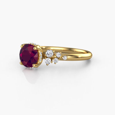 This 14 Carat gold ring is called Emma RND and is set with rhodolite. How would you describe the style of the love of your life? Does she have a unique sense of style? This stunning refined gold engagement ring can be custom-made to your own or her liking. Our rhodolite gemstones have been carefully selected because we believe your fantasy engagement ring must be adorned with nothing but the most beautiful gemstone. Don't you agree? This jewel is made just for you by our master goldsmiths in our own studio.By using our modern techniques, we can design and customize the finest quality jewels with the utmost care for you. Our engagement rings are always priced 30 percent lower than other jewellers. We make engagement rings to order so we don't have to maintain a large stock. If you have a certain budget, we are more than happy to advice you accordingly.Have you found a specific engagement ring somewhere which you would like to give to your loved one? Please feel free to express your wishes to our jewel designers because we would be honoured to turn your design into a fantasy engagement ring. You can follow the development of your ring design because we use 3D drawings. This gives you a realistic preview of how your design will look. You can also preorder a dummy. A dummy is a plastic ring, which can be shaped according your ring design. You can try it on and check if its width and size are suitable for you. We will gladly send you a non-binding offer, based on a fair price/ quality ratio. It will amaze you, considering the quality of the ring and gemstones.To make it easier for you, we offer a 30 day return policy. Check our terms and conditions.