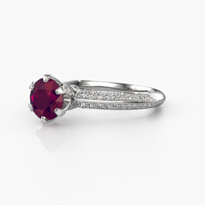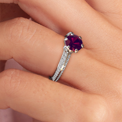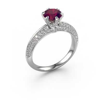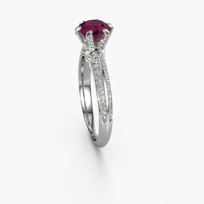 The ring shown above is called the Abby. We call this type of ring a pavé solitaire ring because it has one centre gemstone and a band that is also pave set with gemstones. The platinum engagement ring is set with a round 6.5 mm rhodolite centre stone and the band is pave set with diamond gemstones. Each jewel is made just for you by our master goldsmiths in our own studio.This exclusive platinum pavé solitaire engagement ring has an exquisite round rhodolite centre stone. To further accentuate the centre stone, the band is fully set with more diamonds. Its open prong setting allows light to strike the rhodolite from various angles and this adds sparkle to your rhodolite ring. The photo shown above depicts the goldsmith's carefully handcrafted details of the ring. The high positioning of the centre stone is truly eye-catching. The perfect engagement ring for the crown jewel of your life! Are you on a budget? Please feel free to contact us, so we can go discuss your options. We offer our engagement rings at guaranteed best price, because we make them to order. You won't find such a price anywhere else!Our team adds new designs to our online collection daily. Our designers and goldsmiths work together in creating the best design. We strive to offer a diverse collection of jewels. Perhaps you have a specific jewel design in mind. One you came across somewhere. Please contact us for a free consultation. We will make you an offer, based on a fair price/ quality ratio, that will baffle you.To make it easier for you, we offer a 30 day return policy. Check our terms and conditions.