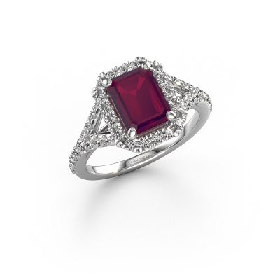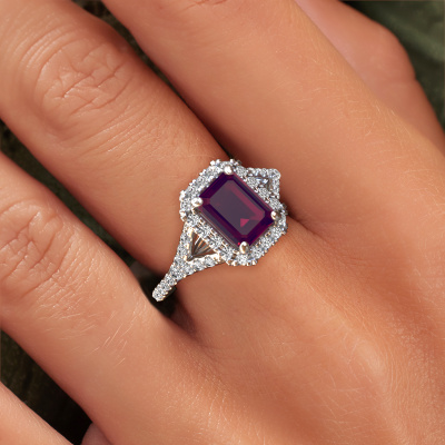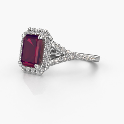 The ring shown above is called the Kimber EME. We call this type of ring a pavé solitaire ring because it has one centre gemstone and a band that is also pave set with gemstones. The platinum engagement ring is set with a emerald cut 8x6 mm rhodolite centre stone and the band is pave set with lab grown diamond gemstones. Each jewel is made by a team of passionate goldsmiths and jewel designers. This will make your crown jewel truly eye-catching.This exclusive platinum pavé solitaire engagement ring has an exquisite emerald cut rhodolite centre stone. To further accentuate the centre stone, the band is fully set with more lab-grown diamonds. Its open prong setting allows light to strike the rhodolite from various angles and this adds sparkle to your rhodolite ring. The photo shown above depicts the goldsmith's carefully handcrafted details of the ring. The high positioning of the centre stone is truly eye-catching. The perfect engagement ring for the crown jewel of your life! By using a combination of the latest modern techniques, combined with ancient crafting, we can make all our engagement rings in our own studio. Each jewel is made to order. This is advantageous because we can offer you a price you won't find anywhere else.Our team adds new designs to our online collection daily. Our designers and goldsmiths work together in creating the best design. We strive to offer a diverse collection of jewels. Perhaps you have a specific jewel design in mind. One you came across somewhere. Please contact us for a free consultation. We will make you an offer, based on a fair price/ quality ratio, that will baffle you.To make it easier for you, we offer a 30 day return policy. Check our terms and conditions.