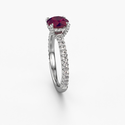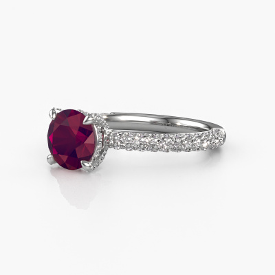 The ring shown above is called the Saskia rnd 2. We call this type of ring a pavé solitaire ring because it has one centre gemstone and a band that is also pave set with gemstones. The platinum engagement ring is set with a round 7 mm rhodolite centre stone and the band is pave set with lab grown diamond gemstones. Each jewel is made by a team of passionate goldsmiths and jewel designers. This will make your crown jewel truly eye-catching.This exclusive platinum pavé solitaire engagement ring has an exquisite round rhodolite centre stone. To further accentuate the centre stone, the band is fully set with more lab-grown diamonds. Its open prong setting allows light to strike the rhodolite from various angles and this adds sparkle to your rhodolite ring. The photo shown above depicts the goldsmith's carefully handcrafted details of the ring. The high positioning of the centre stone is truly eye-catching. The perfect engagement ring for the crown jewel of your life! After receiving your order, our goldsmiths will passionately start the creative process of making your engagement ring in our own studio. Because we don't have a big stockpile, these costs will not be passed on to you. Our pricing is proof of that! We offer top quality jewels at lowest price, guaranteed.Our team adds new designs to our online collection daily. Our designers and goldsmiths work together in creating the best design. We strive to offer a diverse collection of jewels. Perhaps you have a specific jewel design in mind. One you came across somewhere. Please contact us for a free consultation. We will make you an offer, based on a fair price/ quality ratio, that will baffle you.To make it easier for you, we offer a 30 day return policy. Check our terms and conditions.