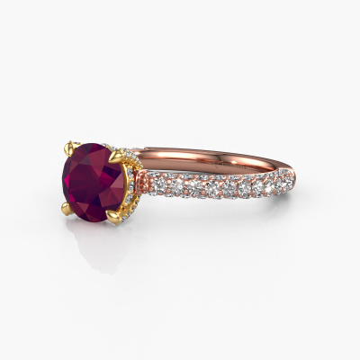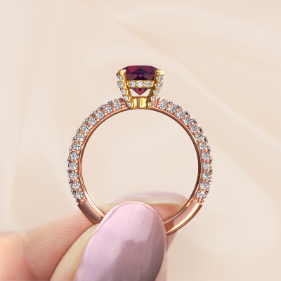 The ring shown above is called the Saskia rnd 2. We call this type of ring a pavé solitaire ring because it has one centre gemstone and a band that is also pave set with gemstones. The 14 Carat rose gold engagement ring is set with a round 7 mm rhodolite centre stone and the band is pave set with lab grown diamond gemstones. Each jewel is made by a team of passionate goldsmiths and jewel designers. This will make your crown jewel truly eye-catching.This exclusive rose gold pavé solitaire engagement ring has an exquisite round rhodolite centre stone. To further accentuate the centre stone, the band is fully set with more lab-grown diamonds. Its open prong setting allows light to strike the rhodolite from various angles and this adds sparkle to your rhodolite ring. The photo shown above depicts the goldsmith's carefully handcrafted details of the ring. The high positioning of the centre stone is truly eye-catching. The perfect engagement ring for the crown jewel of your life! After receiving your order, our goldsmiths will passionately start the creative process of making your engagement ring in our own studio. Because we don't have a big stockpile, these costs will not be passed on to you. Our pricing is proof of that! We offer top quality jewels at lowest price, guaranteed.Our team adds new designs to our online collection daily. Our designers and goldsmiths work together in creating the best design. We strive to offer a diverse collection of jewels. Perhaps you have a specific jewel design in mind. One you came across somewhere. Please contact us for a free consultation. We will make you an offer, based on a fair price/ quality ratio, that will baffle you.To make it easier for you, we offer a 30 day return policy. Check our terms and conditions.