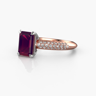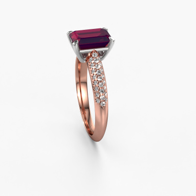 The ring shown above is called the Morane EME. We call this type of ring a pavé solitaire ring because it has one centre gemstone and a band that is also pave set with gemstones. The 14 Carat rose gold engagement ring is set with a emerald cut 8x6 mm rhodolite centre stone and the band is pave set with lab grown diamond gemstones. Each jewel is made just for you by our master goldsmiths in our own studio.This unique rose gold pavé solitaire engagement ring has an exquisite emerald cut rhodolite centre stone. To further accentuate the centre stone, the band is fully set with more lab-grown diamonds. Its open prong setting allows light to strike the rhodolite from various angles and this adds sparkle to your rhodolite ring. The photo shown above depicts the goldsmith's carefully handcrafted details of the ring. The high positioning of the centre stone is truly eye-catching. The perfect engagement ring for the crown jewel of your life! After receiving your order, our goldsmiths will passionately start the creative process of making your engagement ring in our own studio. Because we don't have a big stockpile, these costs will not be passed on to you. Our pricing is proof of that! We offer top quality jewels at lowest price, guaranteed.Our team adds new designs to our online collection daily. Our designers and goldsmiths work together in creating the best design. We strive to offer a diverse collection of jewels. Perhaps you have a specific jewel design in mind. One you came across somewhere. Please contact us for a free consultation. We will make you an offer, based on a fair price/ quality ratio, that will baffle you.To make it easier for you, we offer a 30 day return policy. Check our terms and conditions.