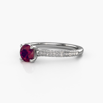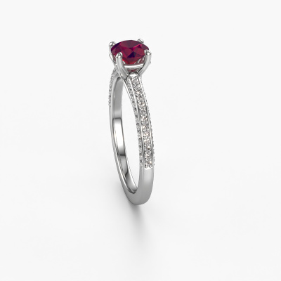 The ring shown above is called the Elenore rnd. We call this type of ring a pavé solitaire ring because it has one centre gemstone and a band that is also pave set with gemstones. This engagement ring is made in 14 Carat white gold set with a 5.4 mm round rhodolite, and pave set lab-grown diamonds at the sides. Each piece of jewellery is made just for you by our master goldsmiths in our own studio.This exclusive white gold pavé solitaire engagement ring has an exquisite round rhodolite centre stone. To further accentuate the centre stone, the band is set full with more lab-grown diamonds. Its open prong setting allows light to strike the rhodolite from various angles and this adds sparkle to your rhodolite ring. The photo shown above depicts the goldsmith's carefully handcrafted details of the ring. The high positioning of the centre stone is truly eye-catching. The perfect engagement ring for the crown jewel of your life!By using a combination of the latest modern techniques, combined with ancient crafting, we can make all our engagement rings in our own studio. Each jewel is made to order. This is advantageous because we can offer you a price you won't find anywhere else.Have you found a specific engagement ring somewhere which you would like to give to your loved one? Please feel free to express your wishes to our jewel designers because we would be honoured to turn your design into a exclusive engagement ring. You can follow the development of your ring design because we use 3D drawings. This gives you a realistic preview of how your design will look. You can also preorder a dummy. A dummy is a plastic ring, which can be shaped according your ring design. You can try it on and check if its width and size are suitable for you. We will gladly send you a non-binding offer, based on a fair price/ quality ratio. It will amaze you, considering the quality of the ring and gemstones.To make it easier for you, we offer a 30 day return policy. Check our terms and conditions.