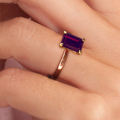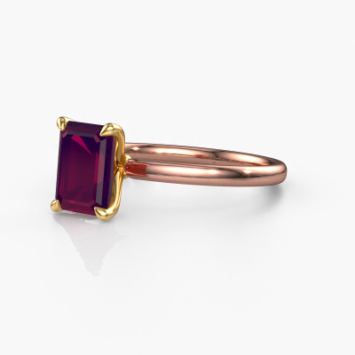 The ring shown above is called the Crystal EME 1, we call this a solitaire ring because it contains a single gemstone. The engagement ring is made in 14 Carat rose gold and has a emerald cut rhodolite of 8x6 mm. The cool thing about our configurator is that you can compile your own piece of jewellery, into a completely personalized one. This solitaire ring is crafted in the precious metals rose gold with gold, but of course you are free to pick your own colours. Each piece of jewellery is made with passion and love by one of our master goldsmiths.The solitaire ring is a special type of engagement ring. Its open prong setting allows light to strike the gemstone from various angles. This classic engagement ring is a stunning eye-catcher because of the high positioning of the gemstone. In order for you to commemorate your proposal with a unique ring, we carefully adorn this solitaire ring by hand. The love of your life deserves nothing but the best. After receiving your order, our goldsmiths will passionately start the creative process of making your engagement ring in our own studio. Because we don't have a big stockpile, these costs will not be passed on to you. Our pricing is proof of that! We offer top quality jewels at lowest price, guaranteed.Our designers and goldsmiths work together each day, creating new jewels. Perhaps you have found a nice classic engagement ring somewhere, which can be used to customize your unique ring. Please feel free to contact us. We will make you an offer, based on a fair price/ quality ratio, which will amaze you.To make it easier for you, we offer a 30 day return policy. Check our terms and conditions.
