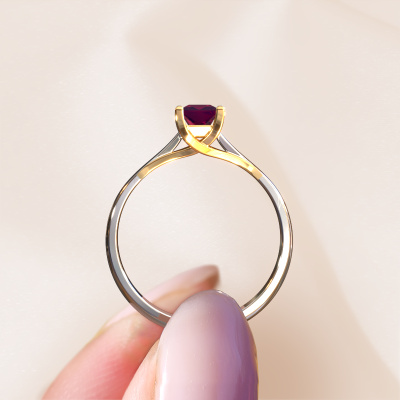 The ring shown above is called the Mia Square, we call this a solitaire ring because it contains a single gemstone. The engagement ring is made in 14 Carat white gold and has a princess rhodolite of 4 mm. The cool thing about our configurator is that you can compile your own piece of jewellery, into a completely personalized one. This solitaire ring is crafted in the precious metals white gold with gold, but of course you are free to pick your own colours. Each piece of jewellery is made by a team of passionate goldsmiths and jewel designers. This will make your crown jewel truly eye-catching.The solitaire ring is a special type of engagement ring. Its open prong setting allows light to strike the gemstone from various angles. This modern engagement ring is a stunning eye-catcher because of the high positioning of the gemstone. In order for you to commemorate your proposal with a unique ring, we carefully adorn this solitaire ring by hand. The love of your life deserves nothing but the best. By using our modern techniques, we can design and customize the finest quality jewels with the utmost care for you. Our engagement rings are always priced 30 percent lower than other jewellers. We make engagement rings to order so we don't have to maintain a large stock. If you have a certain budget, we are more than happy to advice you accordingly.Have you found a specific engagement ring somewhere which you would like to give to your loved one? Please feel free to express your wishes to our jewel designers because we would be honoured to turn your design into a modern engagement ring. You can follow the development of your ring design because we use 3D drawings. This gives you a realistic preview of how your design will look. You can also preorder a dummy. A dummy is a plastic ring, which can be shaped according your ring design. You can try it on and check if its width and size are suitable for you. We will gladly send you a non-binding offer, based on a fair price/ quality ratio. It will amaze you, considering the quality of the ring and gemstones.To make it easier for you, we offer a 30 day return policy. Check our terms and conditions.