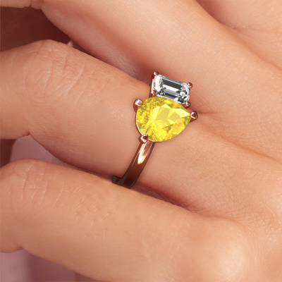 This 14 Carat rose gold ring is called Toi et Moi PER-EME and is set with yellow sapphire. Are you in the market for a unique rose gold engagement ring with a trendy appearance? Then this ring is perfect for you. Simply customize to your or her liking. This chic sparkling engagement ring is set with exquisite yellow sapphire. It has been carefully selected because your engagement ring must be adorned with nothing but the most beautiful gemstone. Our expert goldsmith will create your ring in our own studio where the yellow sapphire will be set with great care. The ring will then be polished to perfection to give it that extra sparkle. The perfect ring for your significant other! By using a combination of the latest modern techniques, combined with ancient crafting, we can make all our engagement rings in our own studio. Each jewel is made to order. This is advantageous because we can offer you a price you won't find anywhere else.Our team adds new designs to our online collection daily. Our designers and goldsmiths work together in creating the best design. We strive to offer a diverse collection of jewels. Perhaps you have a specific jewel design in mind. One you came across somewhere. Please contact us for a free consultation. We will make you an offer, based on a fair price/ quality ratio, that will baffle you.To make it easier for you, we offer a 30 day return policy. Check our terms and conditions.