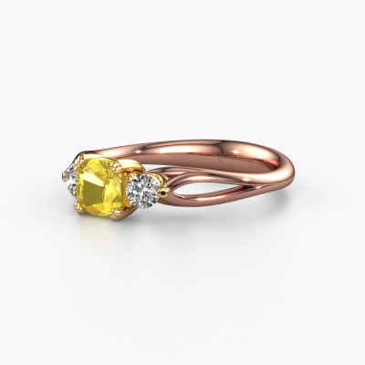 This 14 Carat rose gold ring is called Amie cus and is set with 5 mm yellow sapphire. Does your girlfriend fancy exclusive jewellery? Or would you like to show her that she deserves the finest jewellery? This rose gold ring is pure craftsmanship, love and passion combined with the latest techniques coming together in perfect harmony. It requires a keen eye, patience and a skilful hand to mould this ring into perfection. Just the job for our expert goldsmith! The yellow sapphire set gemstones gives this rose gold ring an extra glamorous appearance. Customize the style of the ajour engagement ring to her liking with a wide variety of precious metals and gemstones which you select. That is how you create a unique ring for the most exclusive woman in your life! This jewel is made just for you, with attention to detail and design.After receiving your order, our goldsmiths will passionately start the creative process of making your engagement ring in our own studio. Because we don't have a big stockpile, these costs will not be passed on to you. Our pricing is proof of that! We offer top quality jewels at lowest price, guaranteed.Have you found a specific engagement ring somewhere which you would like to give to your loved one? Please feel free to express your wishes to our jewel designers because we would be honoured to turn your design into a fantasy engagement ring. You can follow the development of your ring design because we use 3D drawings. This gives you a realistic preview of how your design will look. You can also preorder a dummy. A dummy is a plastic ring, which can be shaped according your ring design. You can try it on and check if its width and size are suitable for you. We will gladly send you a non-binding offer, based on a fair price/ quality ratio. It will amaze you, considering the quality of the ring and gemstones.To make it easier for you, we offer a 30 day return policy. Check our terms and conditions.