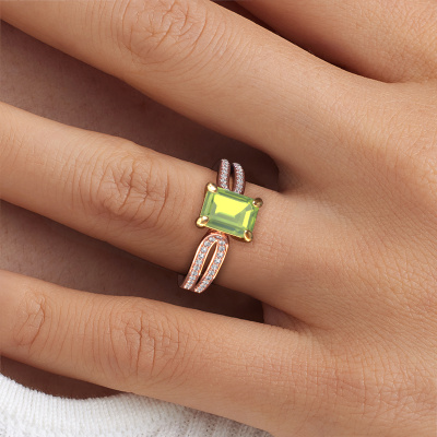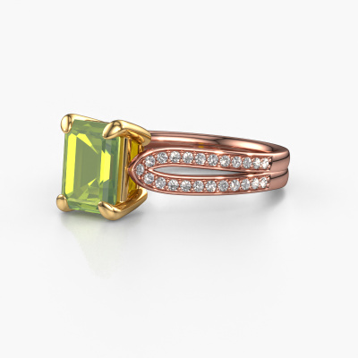 This 14 Carat rose gold ring is called Antonia eme 2 and is set with 8x6 mm peridot. Does your girlfriend fancy exclusive jewellery? Or would you like to show her that she deserves the finest jewellery? This rose gold ring is pure craftsmanship, love and passion combined with the latest techniques coming together in perfect harmony. It requires a keen eye, patience and a skilful hand to mould this ring into perfection. Just the job for our expert goldsmith! The peridot set gemstones gives this rose gold ring an extra glamorous appearance. Customize the style of the split band engagement ring to her liking with a wide variety of precious metals and gemstones which you select. That is how you create a unique ring for the most exclusive woman in your life! This jewel is made to shine bright around your finger. Each jewel is hand made with love by our goldsmiths.After receiving your order, our goldsmiths will start the creative process of making your Antonia eme 2 engagement ring. We don't keep stock. This is advantageous because these costs will not be passed on to you. Therefore, we can offer jewellery at exceptionally low prices.Do you have a specific ring in mind? One you came across somewhere. Please feel free to tell us your wishes and we will turn your design into a unique engagement ring. You can follow the development of your ring design because we use 3D drawings. This gives you a realistic preview of your design. We will gladly send you a non-binding offer, based on a fair price/ quality ratio. It will amaze you.To make it easier for you, we offer a 30 day return policy. Check our terms and conditions.