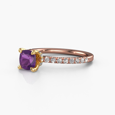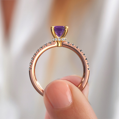 The ring shown above is called the Crystal CUS 4. We call this type of ring a pavé solitaire ring because it has one centre gemstone and a band that is also pave set with gemstones. The 14 Carat rose gold engagement ring is set with a cushion 5.5 mm amethyst centre stone and the band is pave set with diamond gemstones. Each jewel is created to add sparkle to your finger, each jewel is lovingly made by hand by our goldsmiths.This chic rose gold pavé solitaire engagement ring has an exquisite cushion amethyst centre stone. To further accentuate the centre stone, the band is fully set with more diamonds. Its open prong setting allows light to strike the amethyst from various angles and this adds sparkle to your amethyst ring. The photo shown above depicts the goldsmith's carefully handcrafted details of the ring. The high positioning of the centre stone is truly eye-catching. The perfect engagement ring for the crown jewel of your life! By using our modern techniques, we can design and customize the finest quality jewels with the utmost care for you. Our engagement rings are always priced 30 percent lower than other jewellers. We make engagement rings to order so we don't have to maintain a large stock. If you have a certain budget, we are more than happy to advice you accordingly.Do you have a specific ring in mind? One you came across somewhere. Please feel free to tell us your wishes and we will turn your design into a unique engagement ring. You can follow the development of your ring design because we use 3D drawings. This gives you a realistic preview of your design. We will gladly send you a non-binding offer, based on a fair price/ quality ratio. It will amaze you.To make it easier for you, we offer a 30 day return policy. Check our terms and conditions.